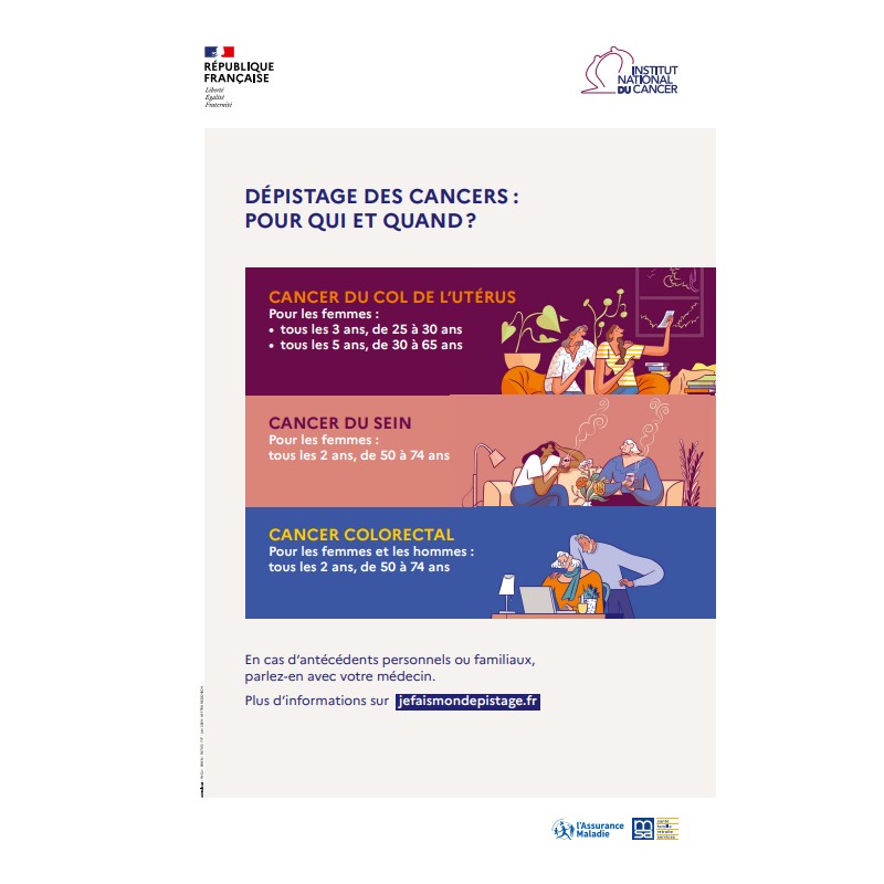 Affiche d’information précisant pour qui et quand sont proposés les 3 programmes de dépistage (colorectal, sein et utérus).Format 40x60 cm