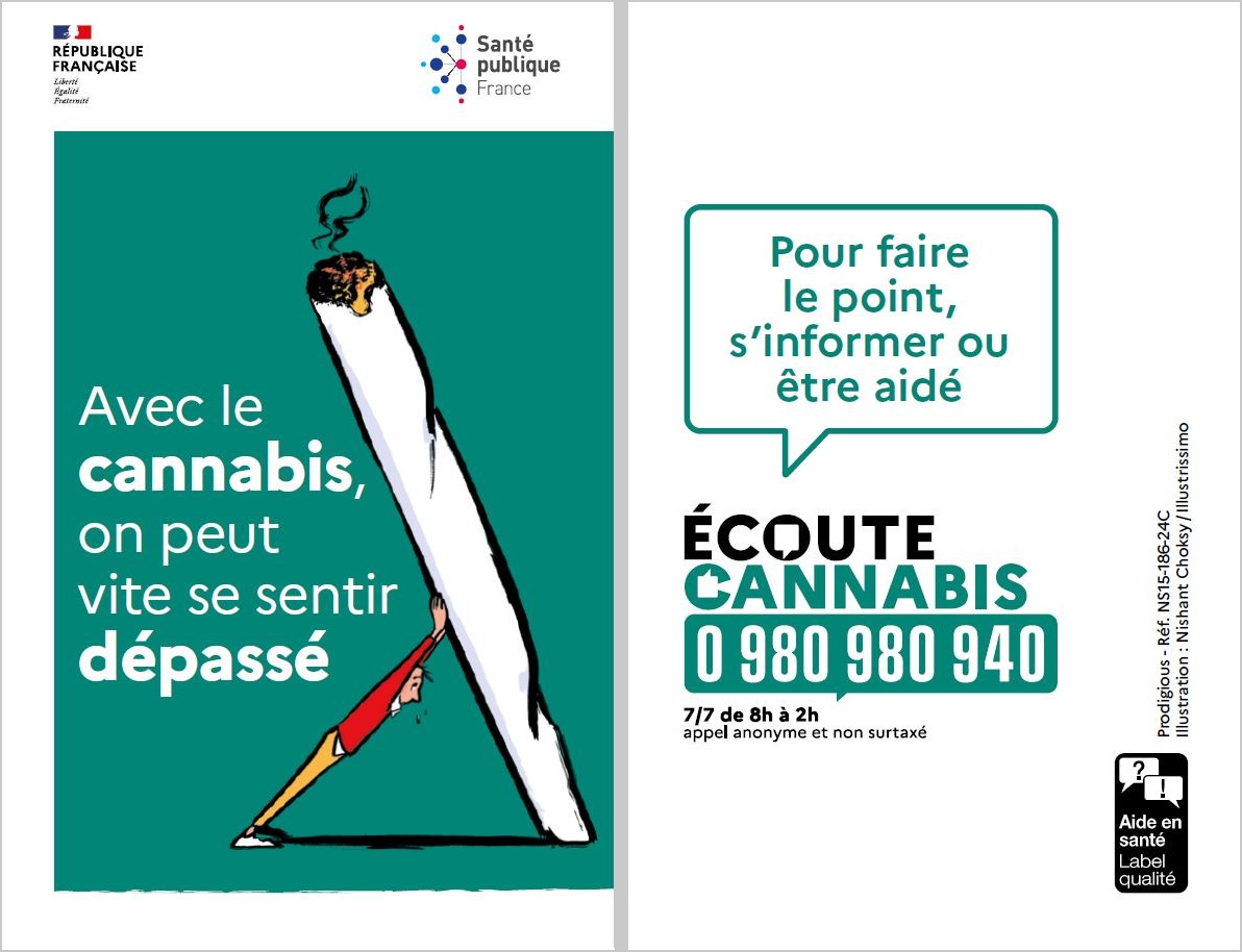 Carte illustrée au format 5,5x8,5 cm faisant la promotion du dispositif d'aide à distance en santé Écoute cannabis.