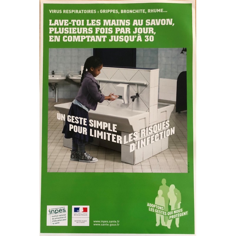 Cette affiche fait partie du premier volet (code vert concernant la prévention des virus respiratoires) de la campagne « Adoptons les gestes qui nous protègent » lancée par le ministère de la Santé et l'Inpes.