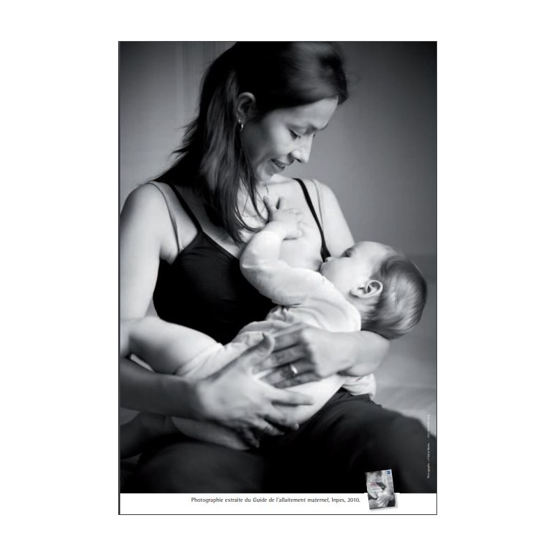 Photographie de Thierry Marius en noir et blanc représentant une mère qui allaite. (Femme en tee-shirt noir, nourrisson qui pose sa main au dessus du sein).